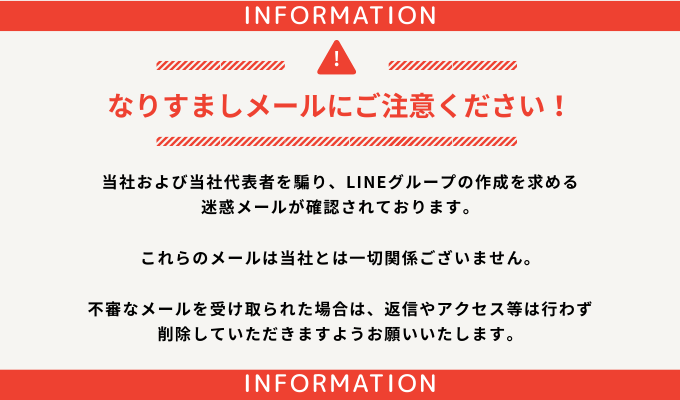 現在、当社および当社代表者を騙ったLINEグループの作成を求める迷惑メール・メッセージが発信されている事実を確認しております。